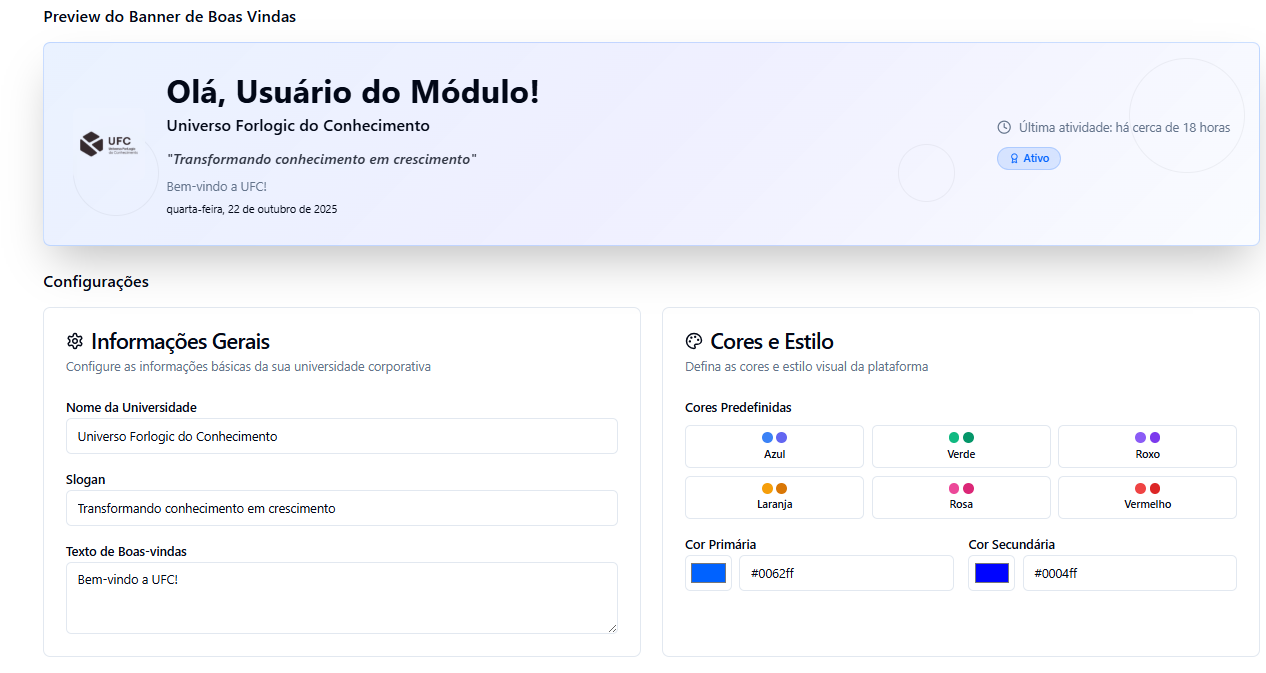 ⚠️ Importante: As alterações impactam todos os usuários vinculados à universidade. Programe mudanças visuais para janelas de baixa utilização.