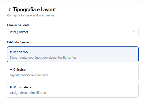 - Escolha Tipografia e Layout do banner e valide no Preview.