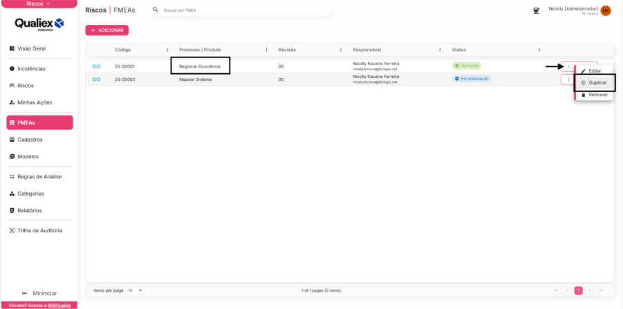 - Objetivo 1: Localizar a opção de "Duplicar" na lista de FMEAs.