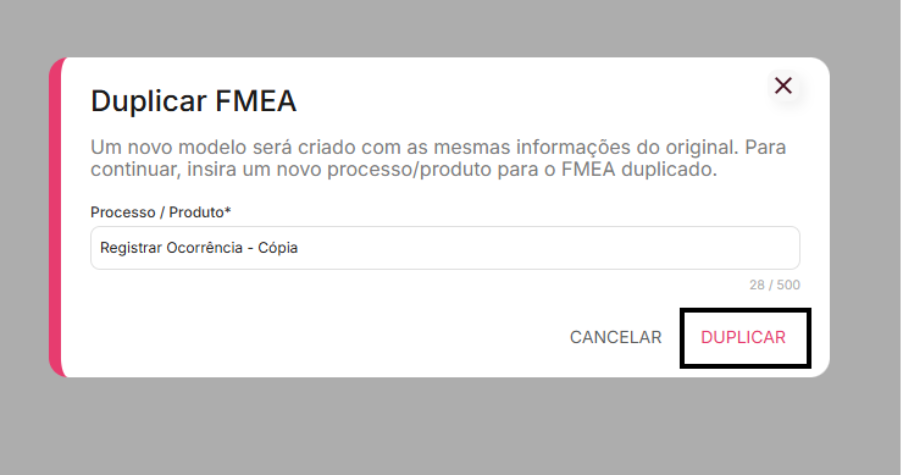 Pronto! Após clicar em "DUPLICAR", a janela de pop-up será fechada e o sistema irá abrir automaticamente a tela de edição do FMEA recém-criado.
