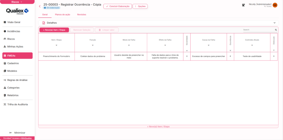 A partir daqui seu trabalho é navegar pelas abas (Geral, Planos de Ação etc.) e fazer os ajustes necessários para este novo processo ou produto que você está analisando.