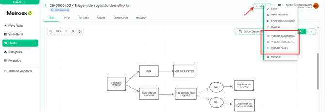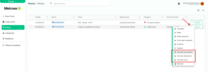 Se você está na tela principal, não precisa nem abrir o fluxo. Clique no botão Opções na linha do processo desejado e escolha o que quer conectar (Vincular documentos, indicadores ou riscos).