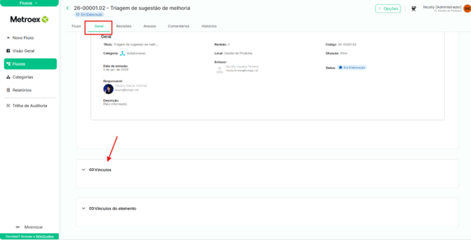 - Acesse a aba Geral do fluxo e vá até a seção Vínculos.