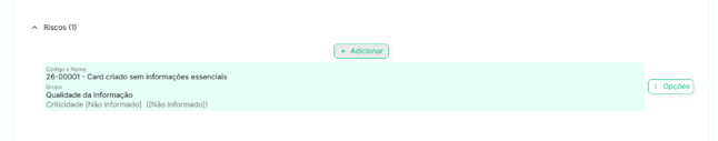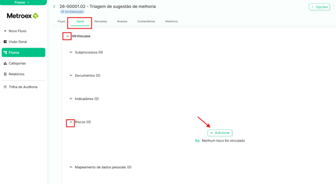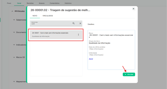 Pronto! O item aparecerá listado na categoria correspondente dentro da aba Geral. Agora, qualquer pessoa que acessar esse processo saberá que ele está relacionado a este risco, documento ou indicador.