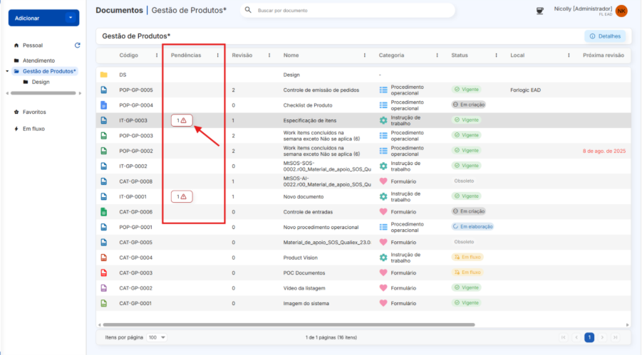 - Na tela principal do módulo "Documentos", localize a nova coluna chamada "Pendências" na sua lista.