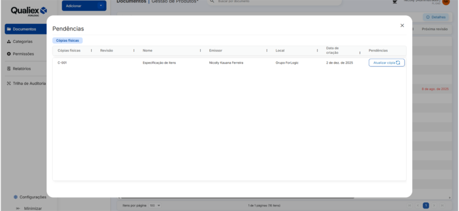 A aba "Cópias Físicas" mostrará uma lista de todas as cópias controladas daquele documento que estão obsoletas e, por isso, precisam de uma ação sua.