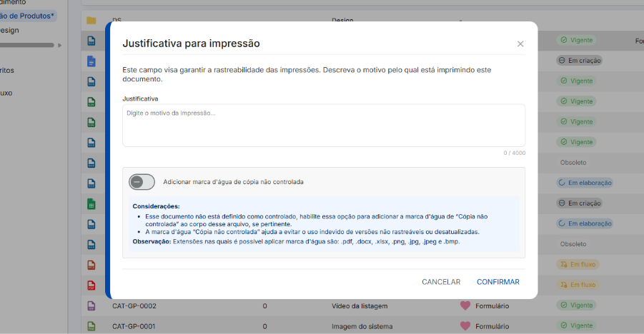 - O Sistema: Oferece a opção de aplicar uma marca d'água ("Cópia Não Controlada") no momento da impressão. Você decide se quer usar essa marca para alertar visualmente que aquele papel não é crítico, ou se prefere imprimir o documento sem nenhuma marca d’água.