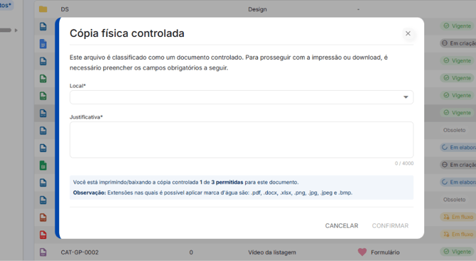 - Ao clicar em "Imprimir" ou "Download" em um documento que é controlado, a janela "Cópia física controlada" aparecerá.