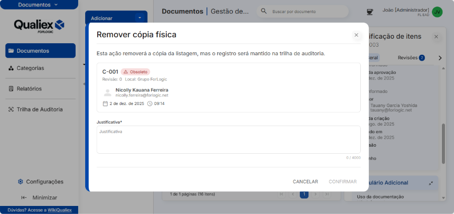 🔑 Para remover uma cópia física é necessário ter a permissão no Papel de "Gerenciar documentos controlados".