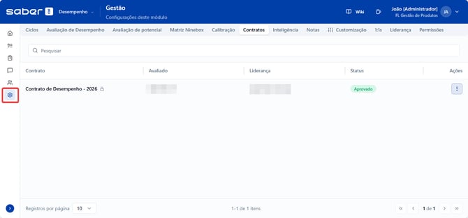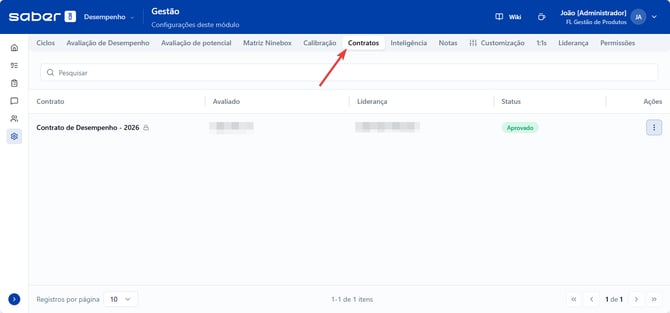 A aba de Contratos dentro do módulo de Gestão funciona como a "torre de controle" das metas da empresa. É aqui que você consegue ter uma visão geral de todos os acordos de desempenho que estão sendo criados, acompanhando o status de cada um sem precisar entrar avaliação por avaliação.