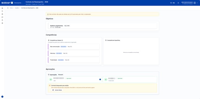 Atenção ao Bloqueio de Edição: Se o contrato já estiver totalmente aprovado pelas duas partes, o sistema exibirá um aviso destacado no topo da tela informando que "Este contrato não pode ser editado pois já foi aprovado pelo líder e colaborador."