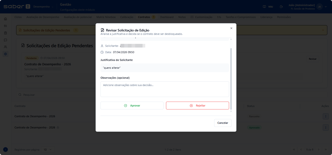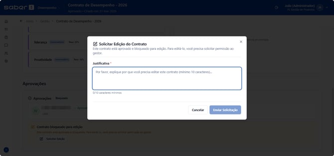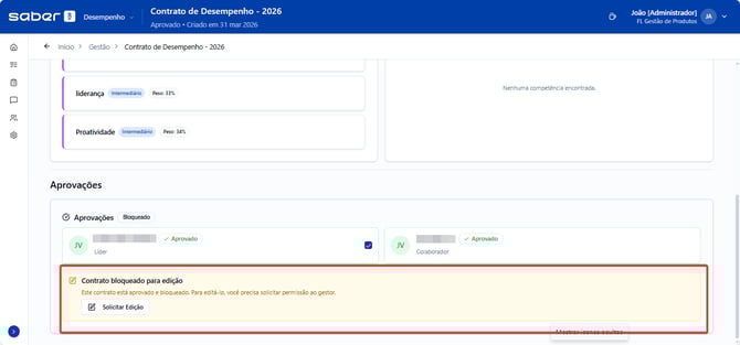 Novo ciclo de aprovação: Assim que a edição é aprovada, o contrato é reaberto. Após realizarem as alterações necessárias nas metas ou competências, o líder e o colaborador precisarão aprovar o documento novamente para que o novo acordo fique oficializado e bloqueado no sistema.