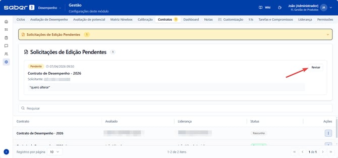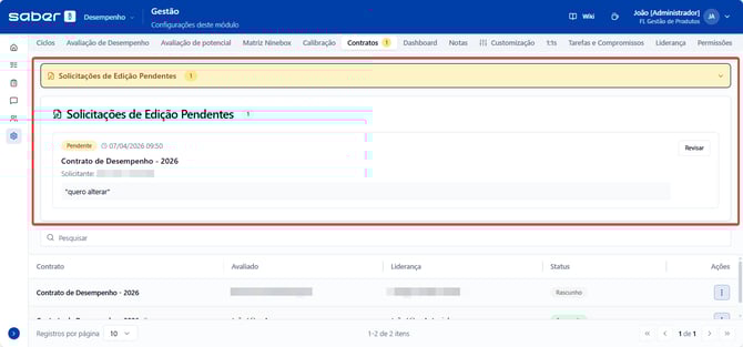 Como revisar a edição (Visão Gestão/Líder): O administrador ou gestor responsável poderá visualizar o pedido na aba de Contratos (dentro de Gestão). Um quadro amarelo chamado Solicitações de Edição Pendentes aparecerá em destaque no topo da tela.