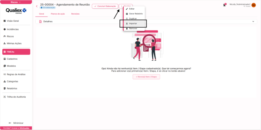 Primeiro, você precisa criar o FMEA que vai receber os dados importados.
