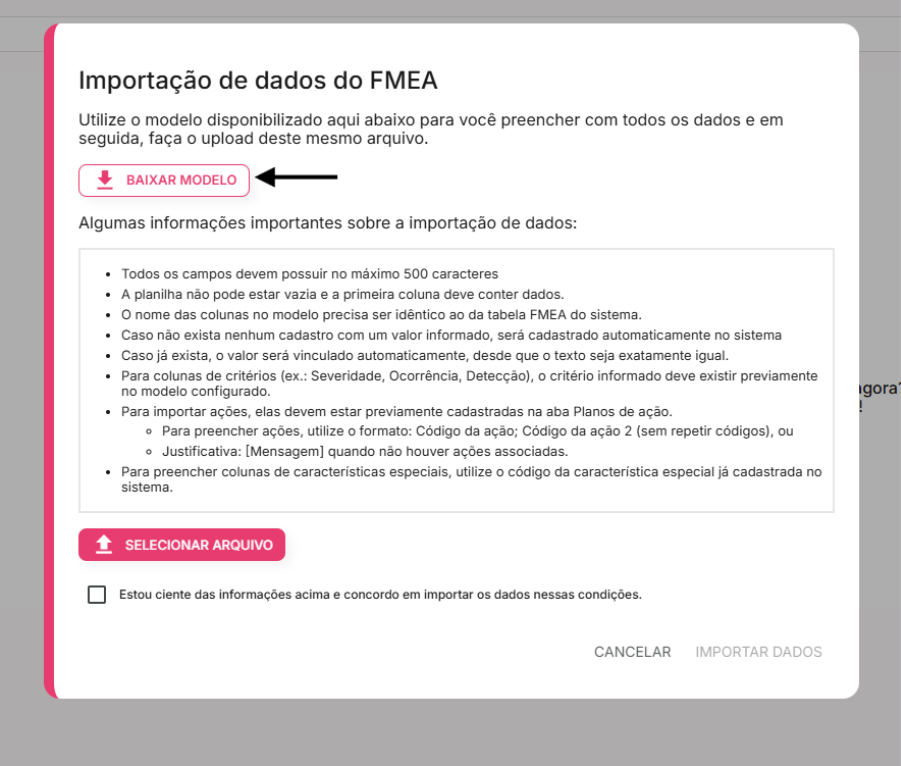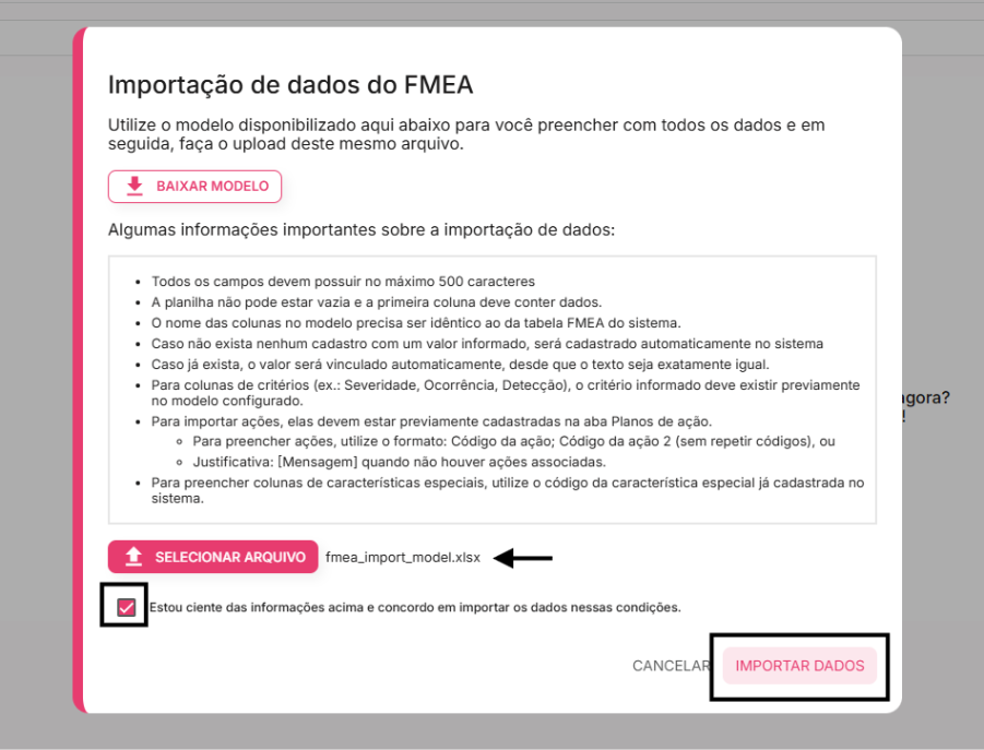 Ao clicar em "Importar", a janela "Importação de dados do FMEA" será aberta. Esta tela é a mais importante do processo.