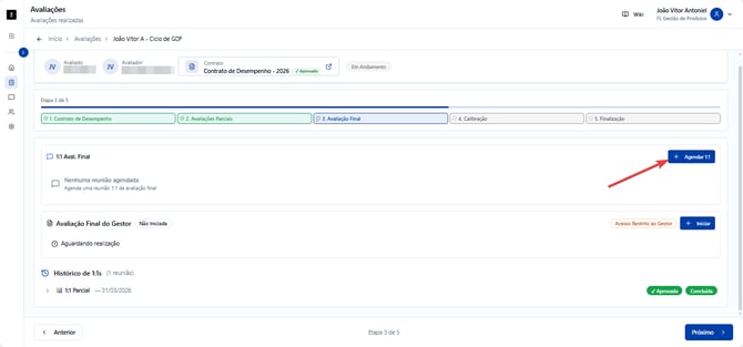 Na seção 1:1 Aval. Final, clique no botão azul + Agendar 1:1.