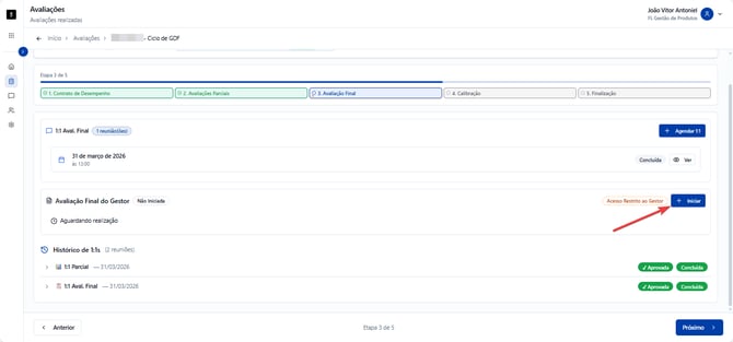 Na seção Avaliação Final do Gestor, clique no botão azul + Iniciar.