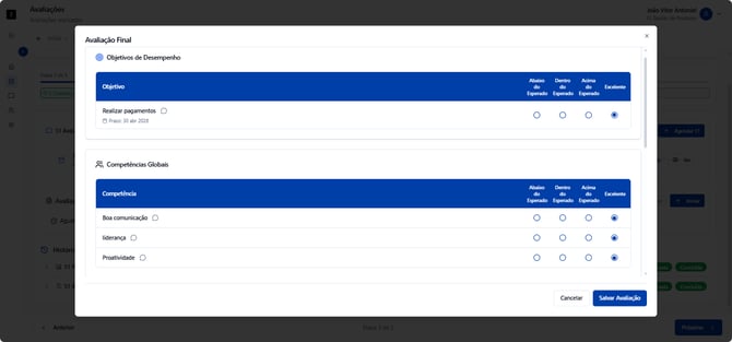 A Avaliação Final é o momento de consolidação de todo o ciclo de desempenho. É a hora de olhar para tudo o que foi construído, os progressos reportados e as avaliações parciais, e definir a nota definitiva do colaborador antes de o processo seguir para a calibração.