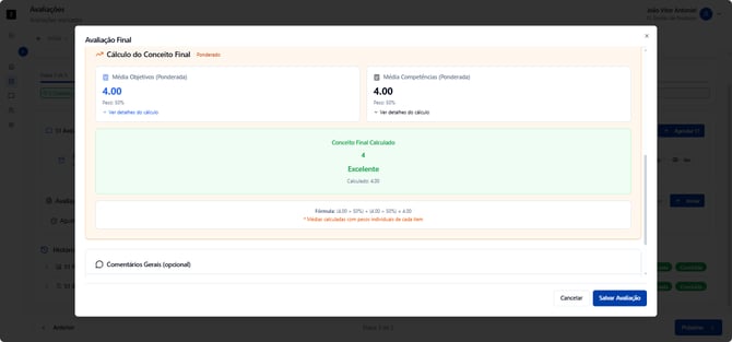 Conceito Final Calculado: É a junção dessas médias, mostrando a nota final, a nomenclatura (ex: "Excelente") e a fórmula exata utilizada (ex: Média Objetivos x Peso + Média Competências x Peso).