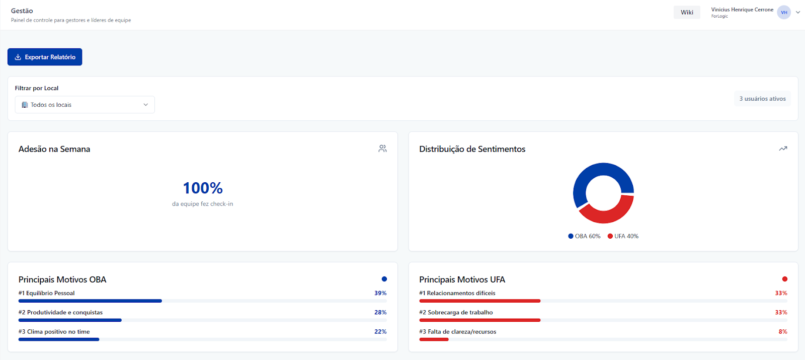 - Análise dos Sentimentos: Um card que usa IA para ler todos os comentários e motivos do período, identificar os principais riscos psicossociais e calcular seu impacto percentual em relação ao total de check-ins.