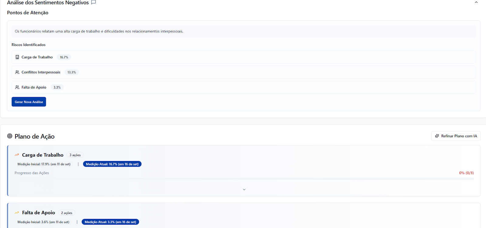 Serve para que os gestores possam monitorar a saúde e o bem-estar de suas equipes de forma contínua e baseada em dados. A página permite identificar padrões de sentimento, detectar riscos psicossociais (conforme a norma ISO 45003), entender as causas-raiz dos problemas e, o mais importante, criar, gerenciar e acompanhar a evolução de planos de ação para melhorar o clima organizacional.