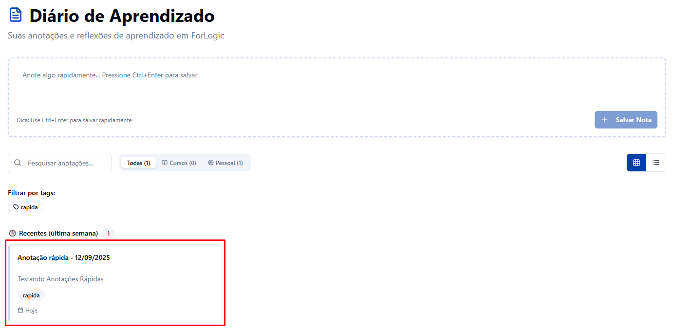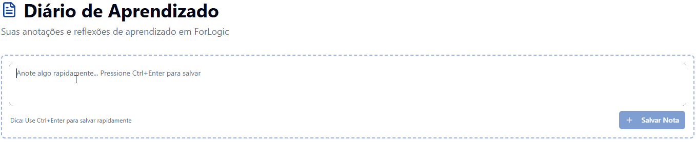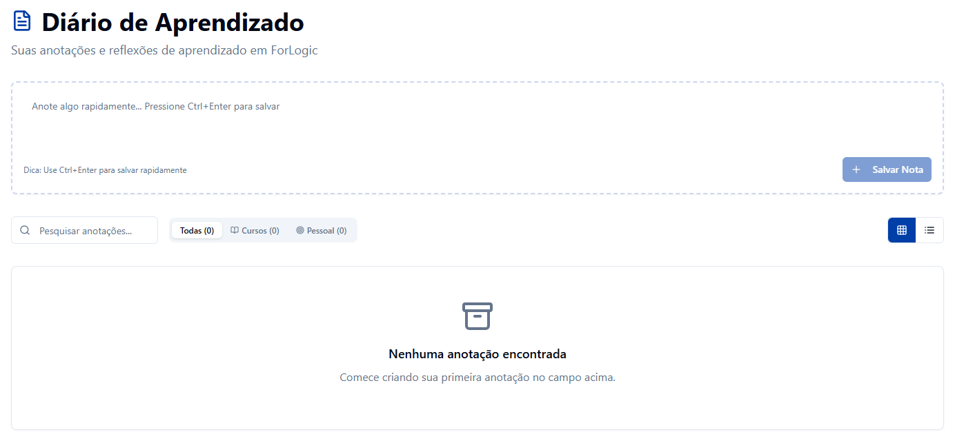 O Diário de Aprendizado é seu repositório pessoal de anotações, reflexões e insights criados durante cursos e trilhas. Funciona como um caderno digital onde todas as suas anotações ficam centralizadas e organizadas para consulta posterior.