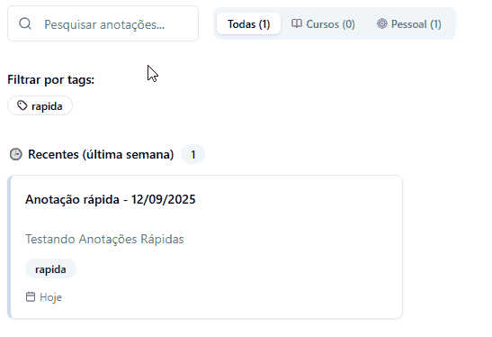 - Organizar por Contexto: Filtra anotações por curso, trilha ou tipo pessoal