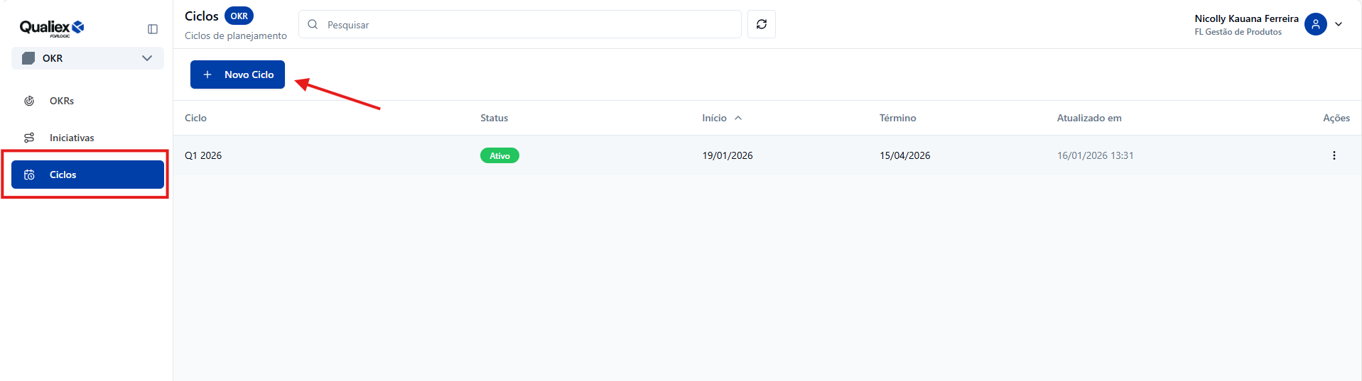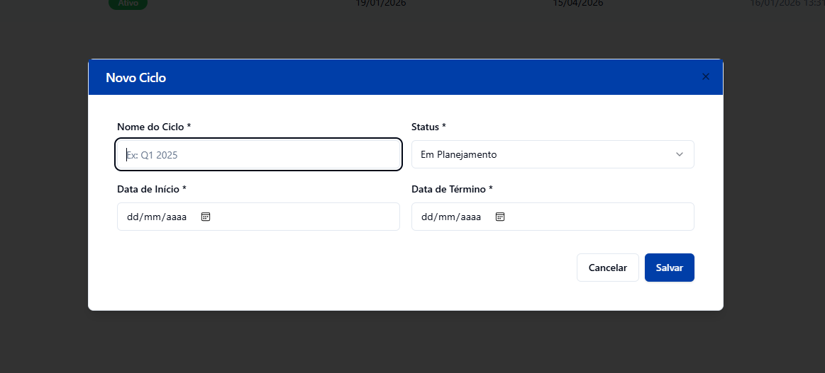 A funcionalidade +Novo Ciclo permite cadastrar novos ciclos de acompanhamento de OKRs no sistema. O ciclo define o período em que os objetivos e resultados-chave estarão ativos (como trimestre, semestre ou ano), garantindo organização e clareza no monitoramento de metas.