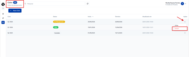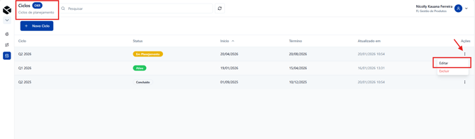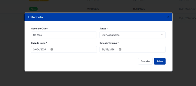 💡 Dica: padronize os nomes dos ciclos (ex.: Q1 2026, Q2 2026) para facilitar buscas e relatórios.