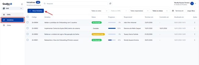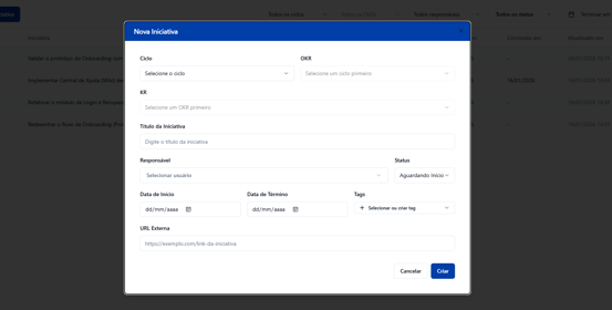Nova Iniciativa permite criar projetos ou ações específicas que contribuem diretamente para o alcance de um Resultado-Chave (KR). Defina título, responsável, prazo e status e vincule a um KR existente para transformar metas estratégicas em tarefas executáveis.