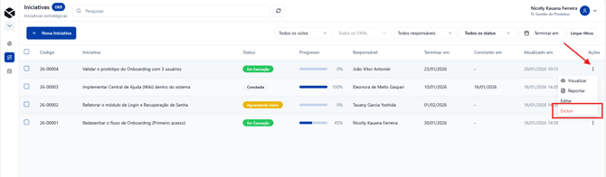 - Encontre a Opção de Excluir: Na linha da iniciativa, procure o menu de opções e clique, dentro do menu, você encontrará a opção "Excluir".