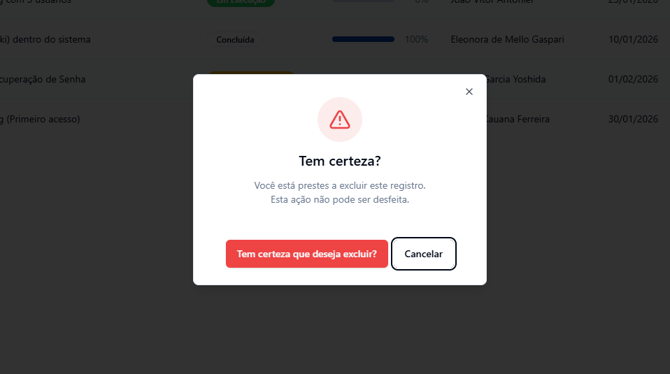 - Clique no botão excluir: Ao clicar no botão de Excluir, uma janela se abrirá pedindo para confirmar a operação, para evitar remoções acidentais.