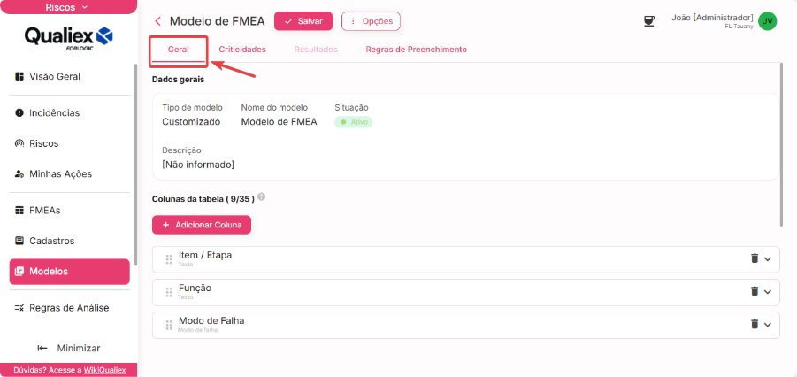 - Acesse o seu Modelo de FMEA e vá para a aba Geral.