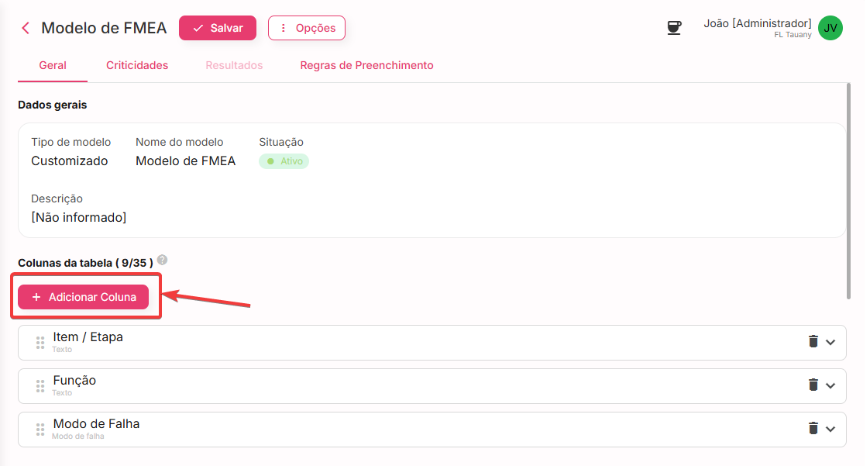 Ao configurar seu Modelo de FMEA na aba Geral, você define quais tipos de informação serão coletados. A escolha do Tipo de Coluna é crucial, pois ela determina a funcionalidade do campo (se ele aceita apenas texto, se calcula um resultado, ou se é um fator de risco).