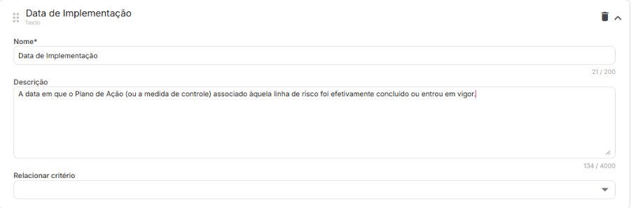Depois: O campo foi parametrizado, alterando o Nome para (Ex: "Data de Implementação") e adicionando uma Descrição clara.
