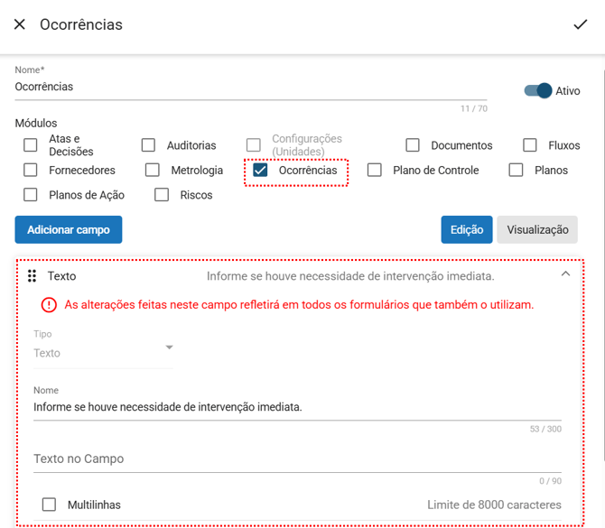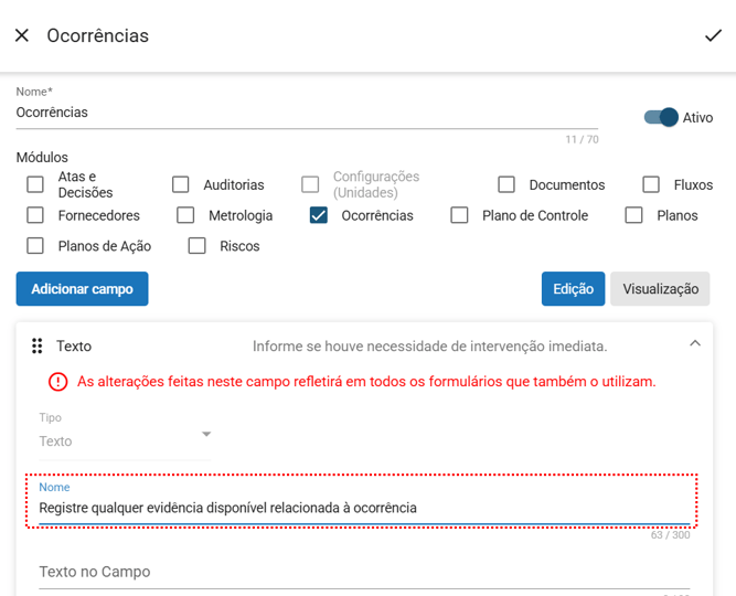 Perceba que, ao alterar o nome de um campo em um formulário que já possui registros, somente o nome será atualizado. As informações já preenchidas pelos usuários não serão modificadas. Esse comportamento ocorre em todos os módulos onde o formulário estiver sendo usado.