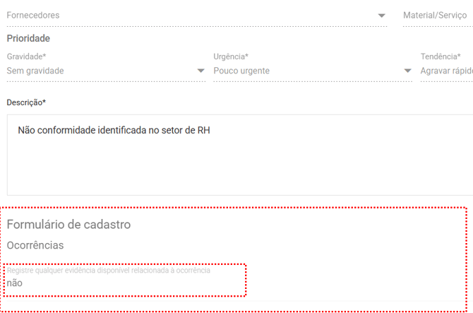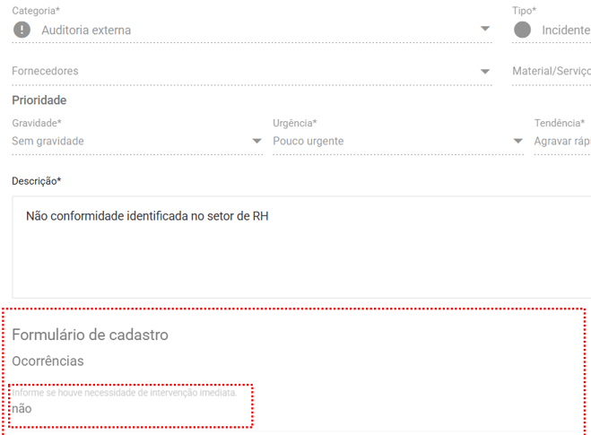 O formulário já preenchido terá seus campos exibidos dessa forma dentro da Ocorrência.