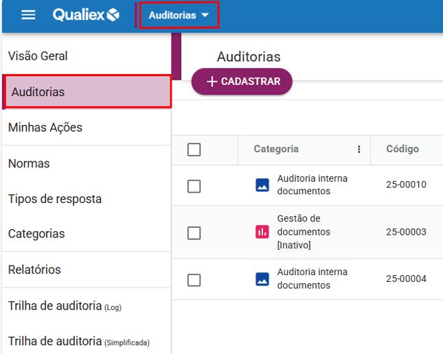 No módulo Auditorias, acesse a aba “Auditorias” para iniciar a inclusão de anexos em uma auditoria. Não é possível adicionar anexos em auditorias que já foram concluídas ou canceladas
