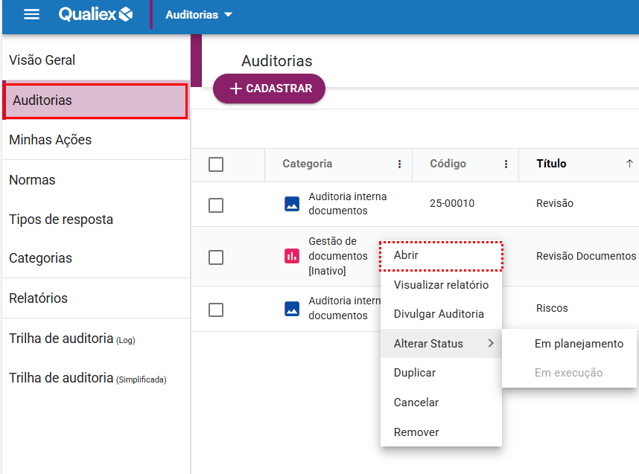 Acesse a aba Auditorias, clique com o botão direito na auditoria desejada e selecione “Abrir”. Se preferir, utilize a mesma opção pelo menu de contexto