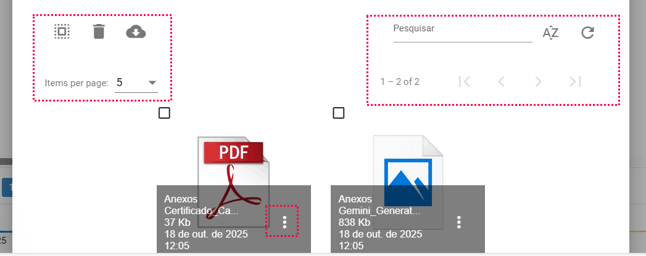 O sistema oferece diversas funcionalidades para facilitar a gestão dos arquivos anexados às ações. Essas ferramentas permitem organizar, localizar, editar e baixar os arquivos de forma prática e eficiente.