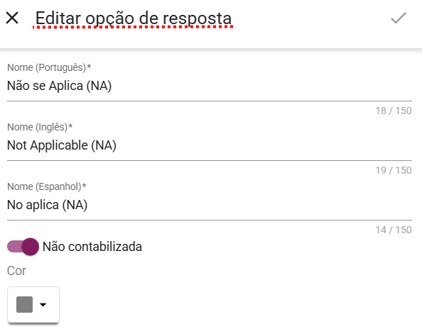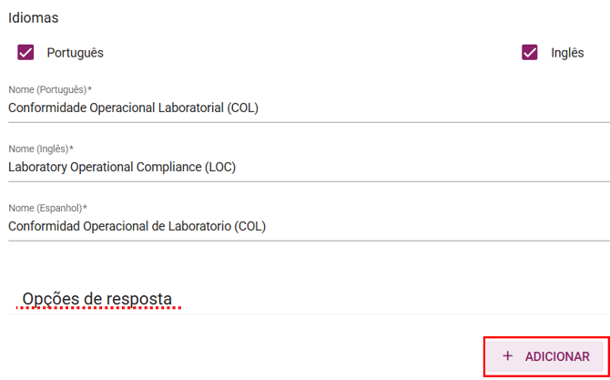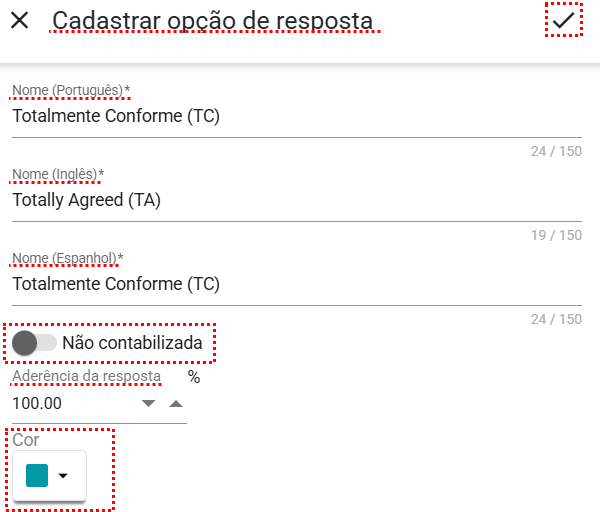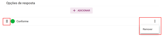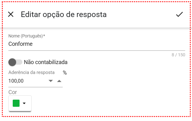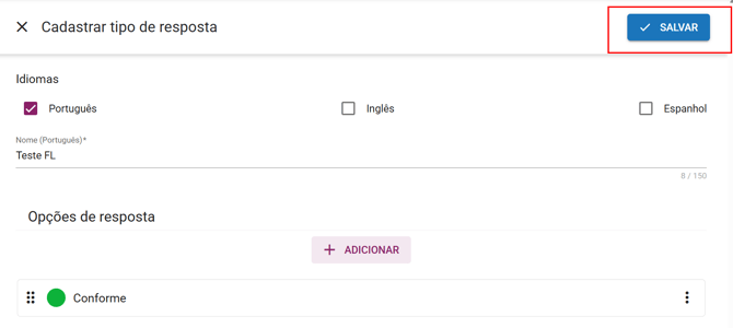 - Nome: qual será o nome dado para a resposta (ex: conforme, não conforme; sim, não)