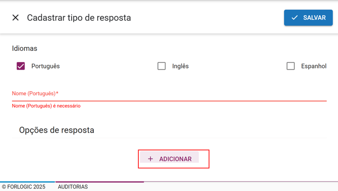 Para cadastrar um Tipo de Resposta, acesse a aba “Tipos de resposta” e clique no botão