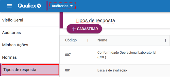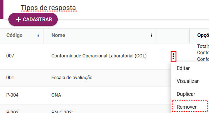 No módulo Auditorias, acesse a aba “Tipos de resposta” para iniciar o processo de remoção de um tipo de resposta já cadastrada.
