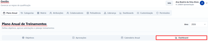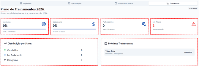 Por meio das dashboards disponíveis na aba “Aprovações”, é possível acompanhar a execução dos treinamentos, o orçamento planejado e utilizado, a quantidade de participantes, além de identificar possíveis atrasos e visualizar a distribuição dos treinamentos por status. Essa ferramenta facilita a gestão estratégica das atividades, permitindo uma análise clara e objetiva de todo o planejamento anual.