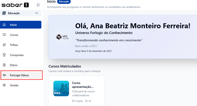 Basta clicar no menu lateral e, em seguida, selecionar o módulo “ForLogic Educa”.