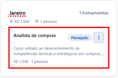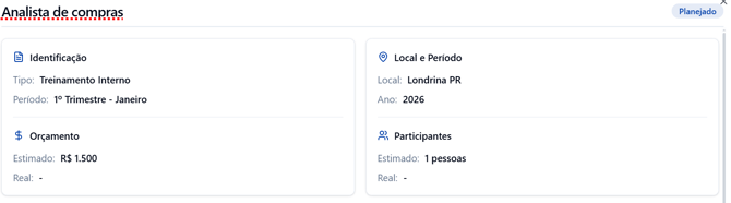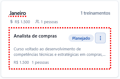 Nesta aba, é possível visualizar todos os treinamentos previstos para o ano. Eles são organizados por mês, indicando qual treinamento será realizado, o orçamento previsto e a quantidade de participantes.
