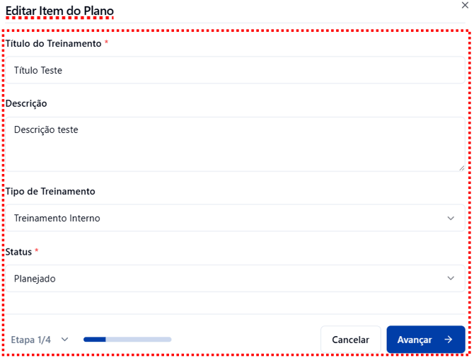 . Desta forma será exibido uma tela para que o colaborador possa realizar as alterações de todas as etapa que seja necessário no treinamento.