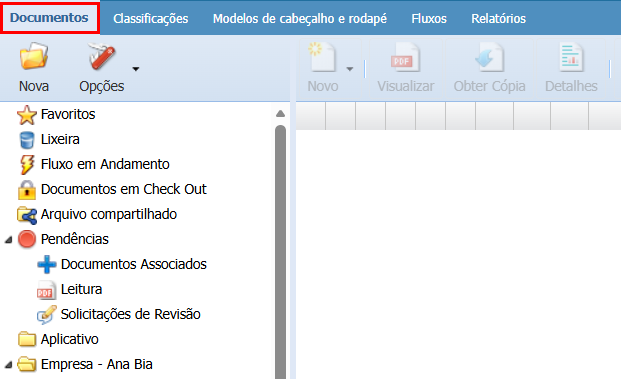 Ao acessar o módulo, a primeira aba exibida será “Documentos”. Nela, você poderá fazer a gestão dos seus documentos, enviando arquivos, criando pastas e utilizando diversas outras funcionalidades.