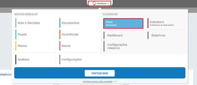 Após realizar o login, clique nos conjuntos de módulos contratados e selecione Docs. Você será direcionado automaticamente para o módulo.