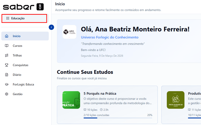 Dentro da plataforma Educação, você encontrará um menu lateral com todos os seus módulos disponíveis.